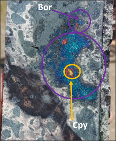 FIGURE 1: BORNITE PATCHES AND CHALCOPYRITE TRACES IN LHCC-23-004