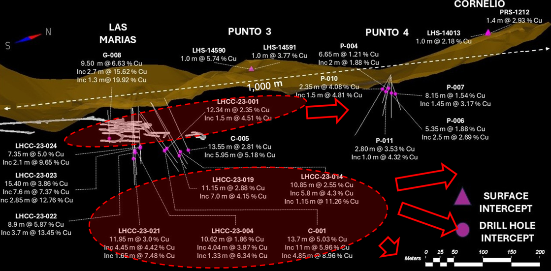 Select results from both programs are shown below, which include C-001 which intercepted 13.7 metres grading 5.03% copper and G-008 which intercepted 9.50 metres grading 6.63% copper both from the historical 2020 program. Results from Axo's Phase I program included LHCC-23-023 which intercepted 15.4 metres grading 3.86% copper including 7.6 metres grading 7.37% copper, as well as LHCC-23-022 which returned 8.9 metres grading 5.87% copper including 3.7 metres grading 13.45% copper.