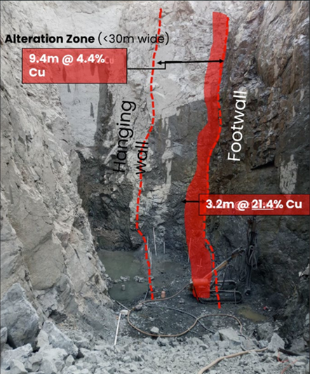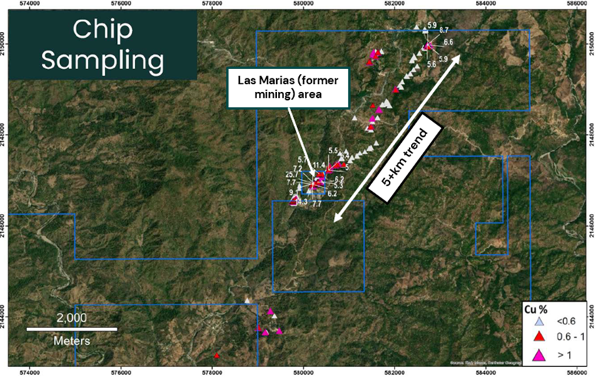 The Las Marias Zone is characterized by copper sulphides, with mineralization hosted in chalcopyrite and bornite (Figure 1), extending to surface. Figure 4 below shows past sampling results from the historical Las Marias pit, which included 3.2 metres grading 21.4% copper, and 9.4 metres grading 4.4% copper. The zone itself lies on the southwest end of the broader La Huerta Trend, characterized by a 5km+ strike length as evidenced by copper samples at surface (see Figure 5 below).